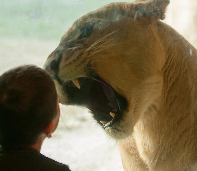 The father of this child obviously has thanked God for thick glass that separates his son from a hungry lioness, whose teeth were only a few centimeters away from his face. These are incredible pictures made at the zoo in Miami, Florida.